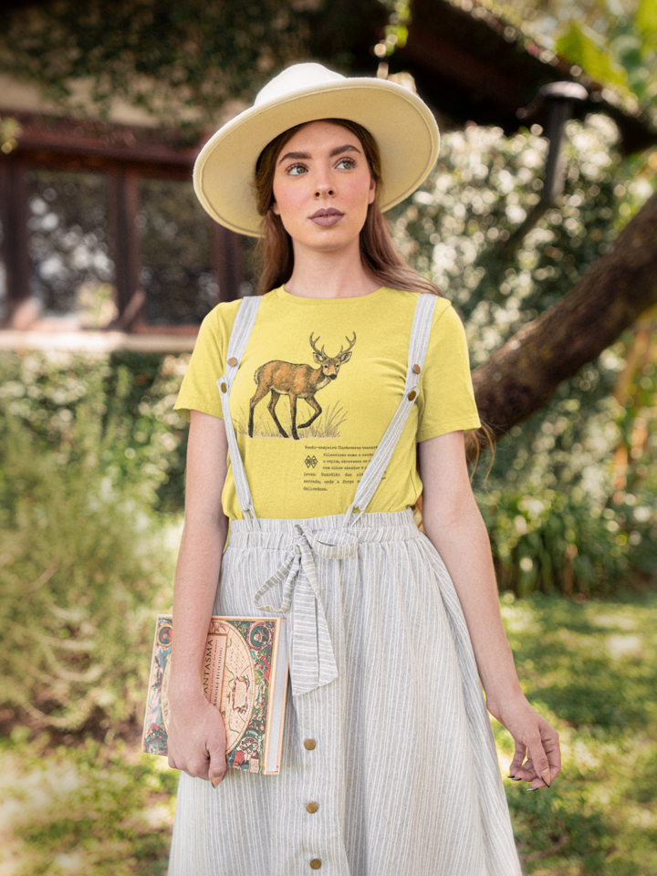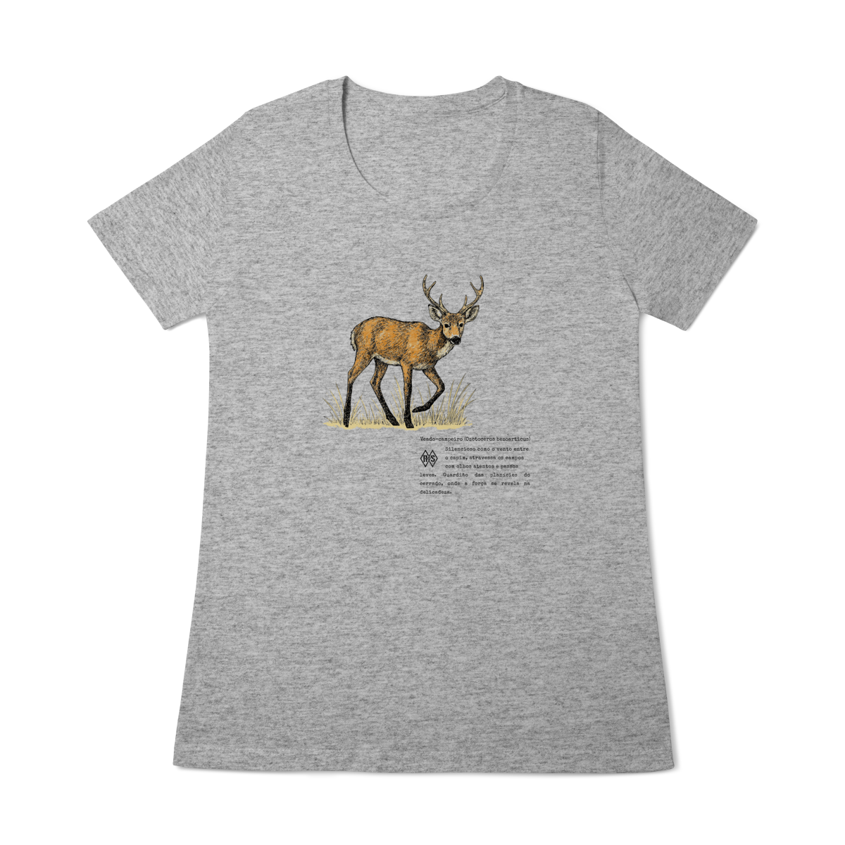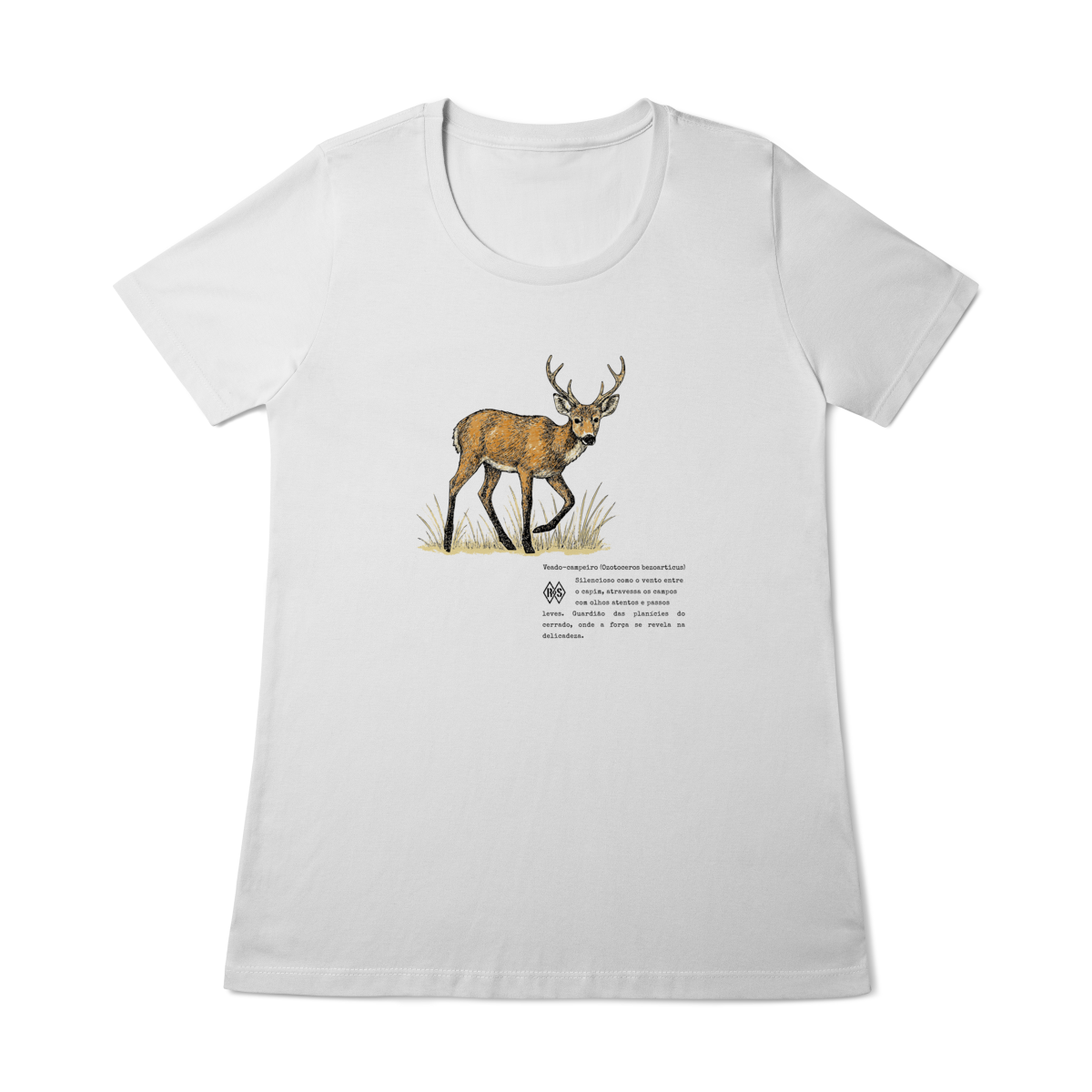 Esta camiseta é um tributo à serenidade e à força silenciosa que habitam o cerrado. O veado-campeiro, guardião das planícies, lembra que delicadeza e coragem podem caminhar lado a lado. É o símbolo da alma livre, que encontra beleza na simplicidade e poder na calma dos próprios passos.