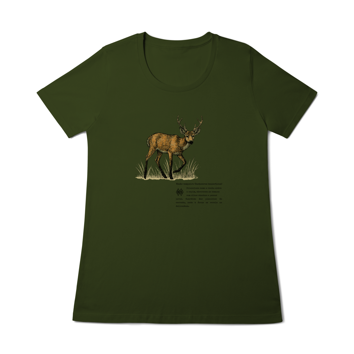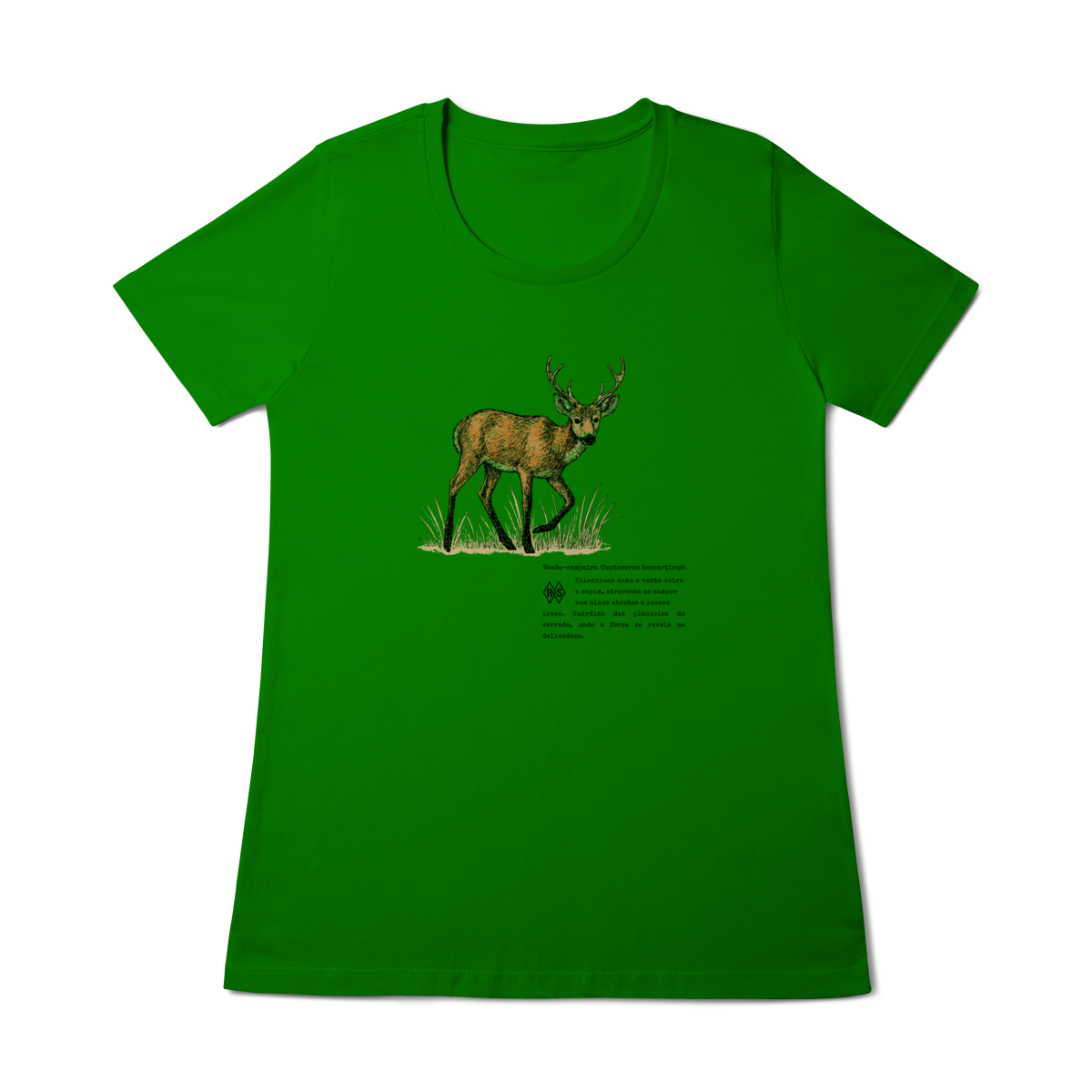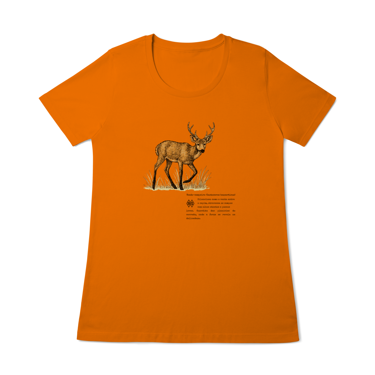 Esta camiseta é um tributo à serenidade e à força silenciosa que habitam o cerrado. O veado-campeiro, guardião das planícies, lembra que delicadeza e coragem podem caminhar lado a lado. É o símbolo da alma livre, que encontra beleza na simplicidade e poder na calma dos próprios passos.