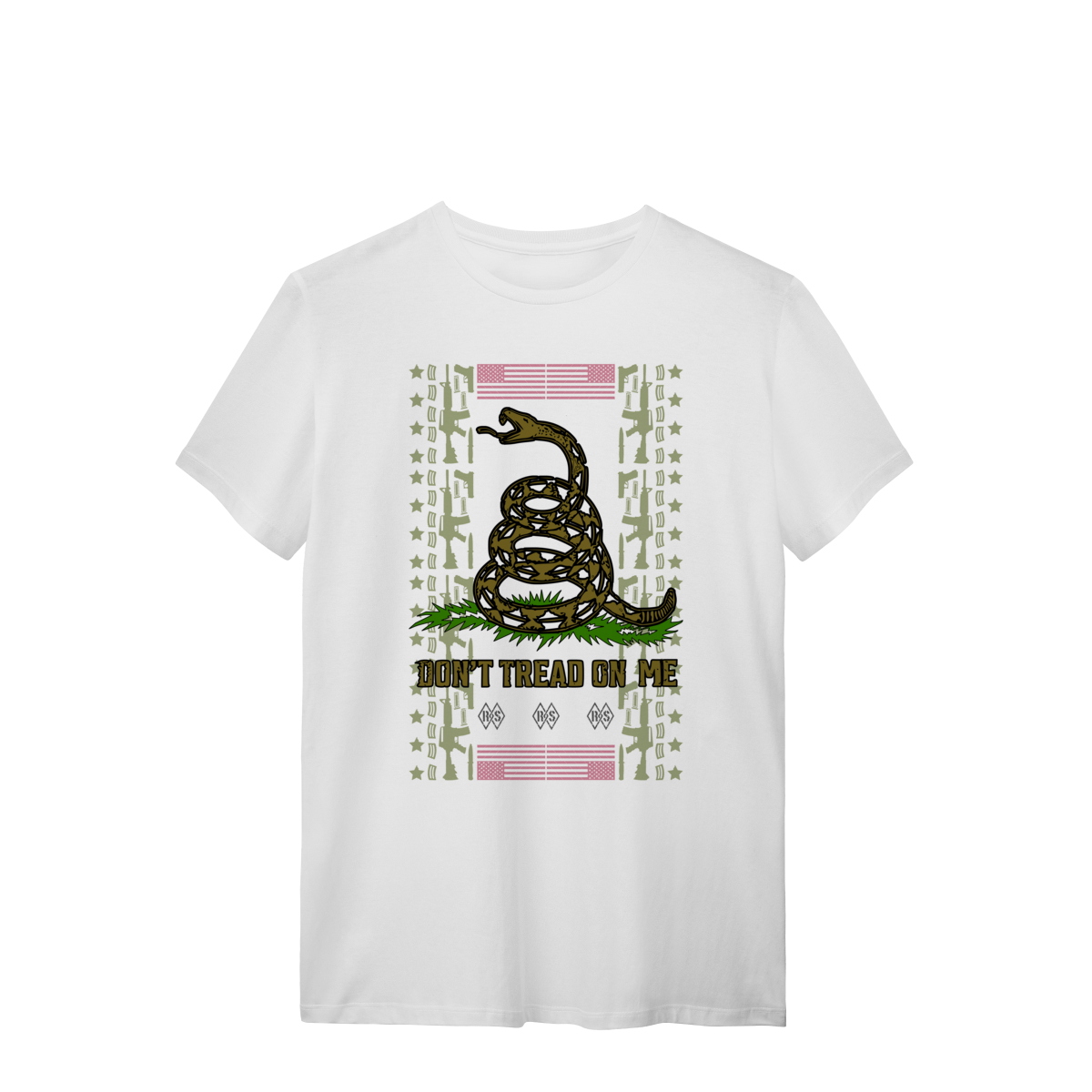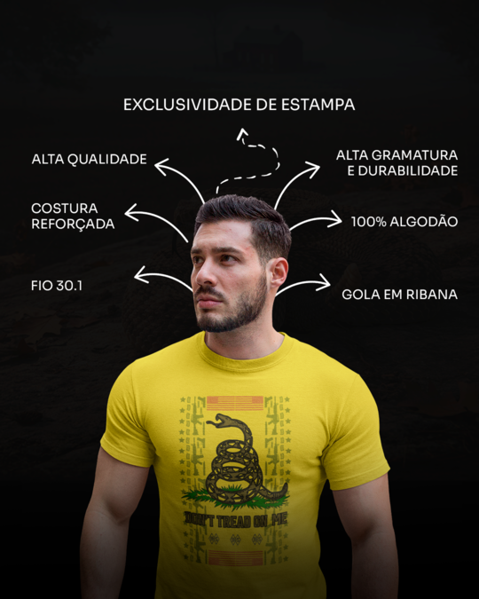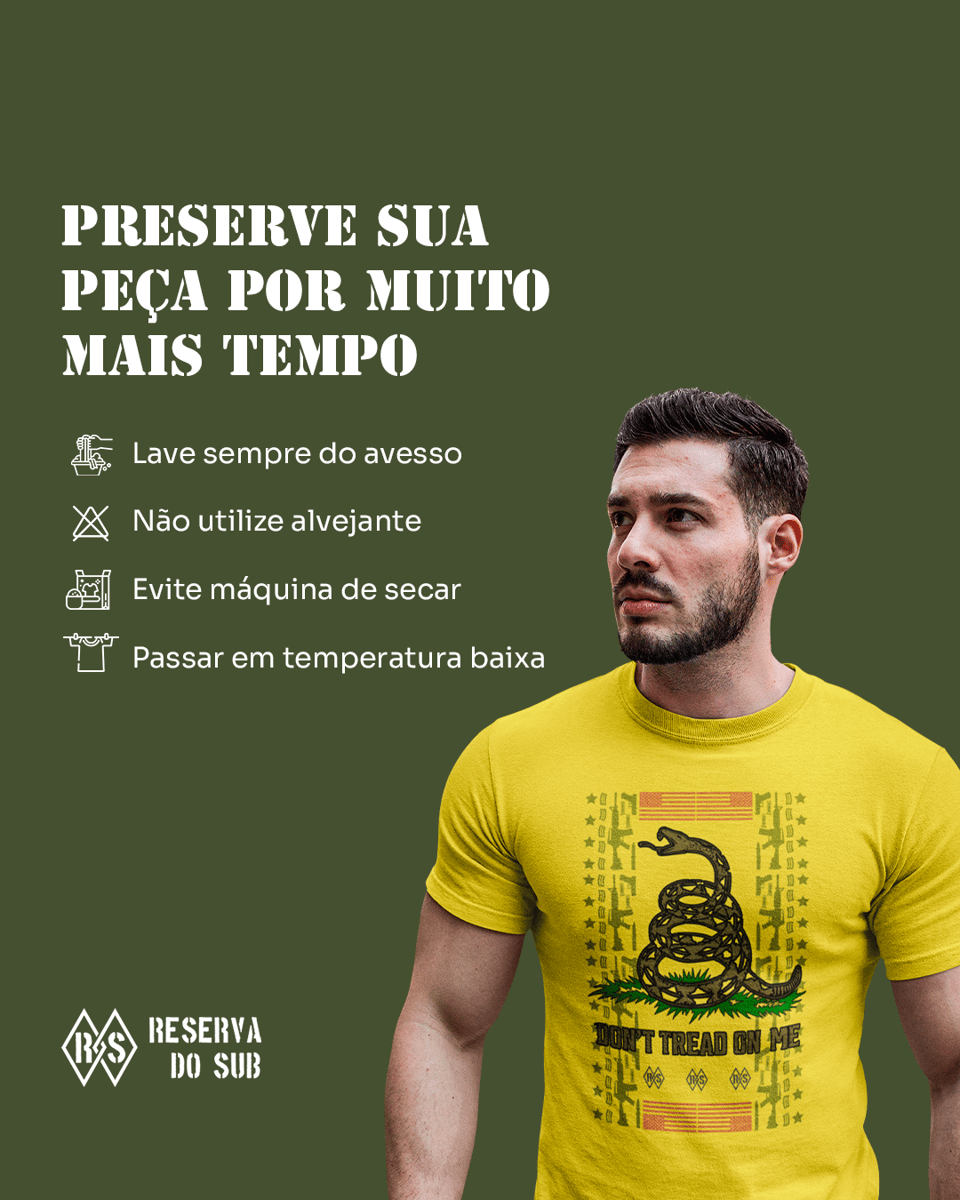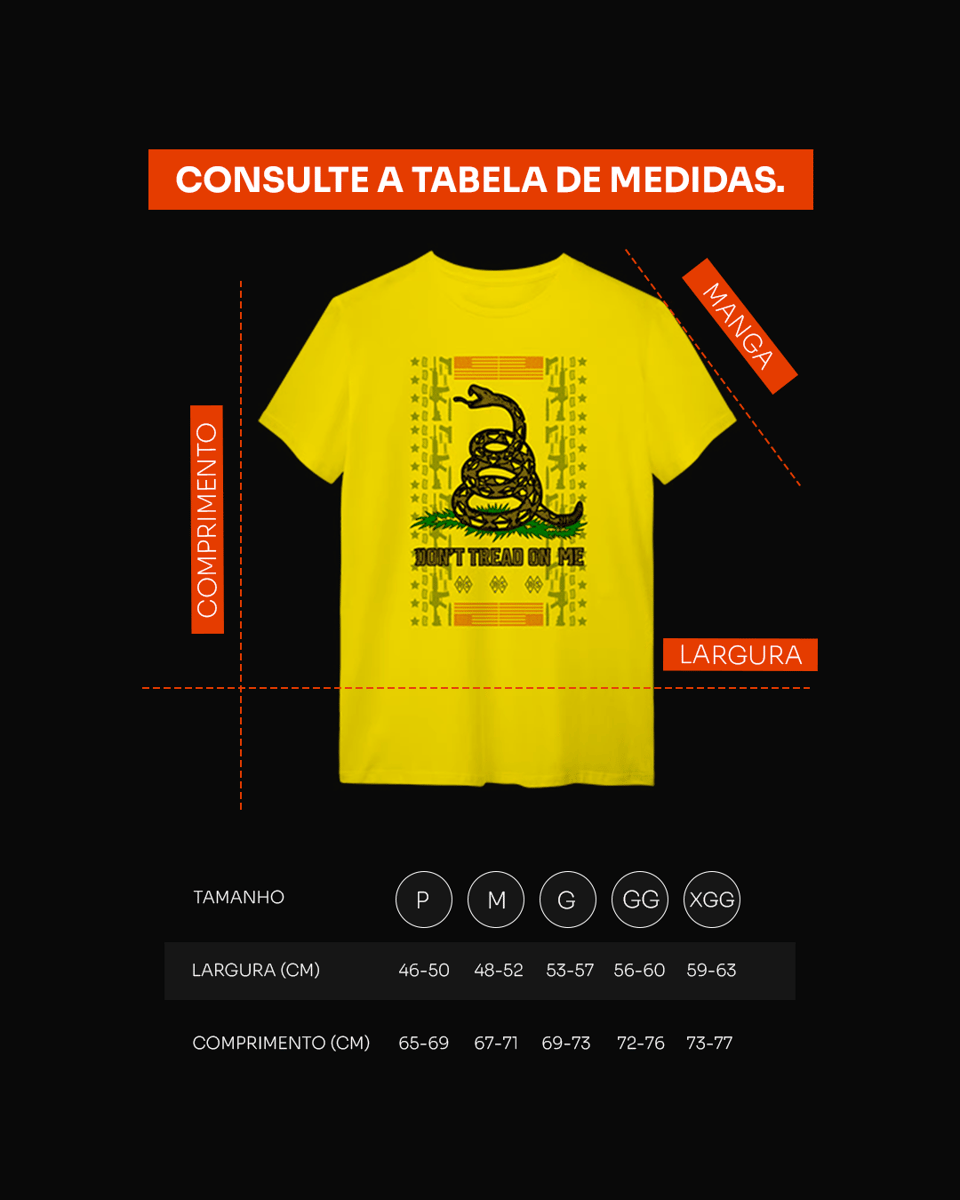 Mais do que uma estampa, é um aviso histórico. A serpente enrolada e pronta para o bote carrega a mensagem imortal da resistência: "Não Pise em Mim". Se tu conheces o valor da liberdade e acredita que a autodefesa é um direito inegociável, esta camiseta é o teu manifesto.