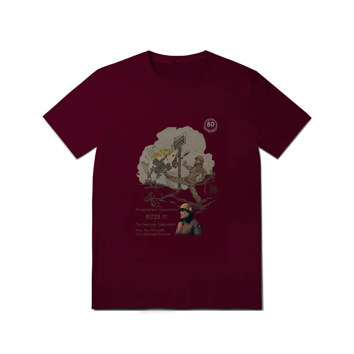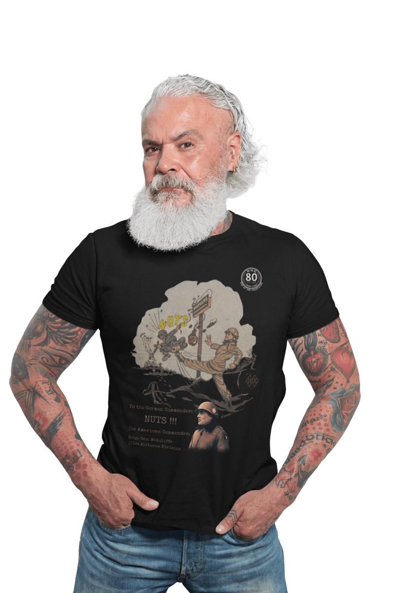 Esta camiseta celebra um dos momentos mais icônicos da 2ª Guerra Mundial: quando o General Anthony McAuliffe, comandante da 101ª Airborne Division, respondeu com uma única palavra: "NUTS!" à exigência de rendição alemã durante o Cerco de Bastogne. Uma resposta que se tornou símbolo de coragem inabalável, resistência extrema e humor sob fogo.