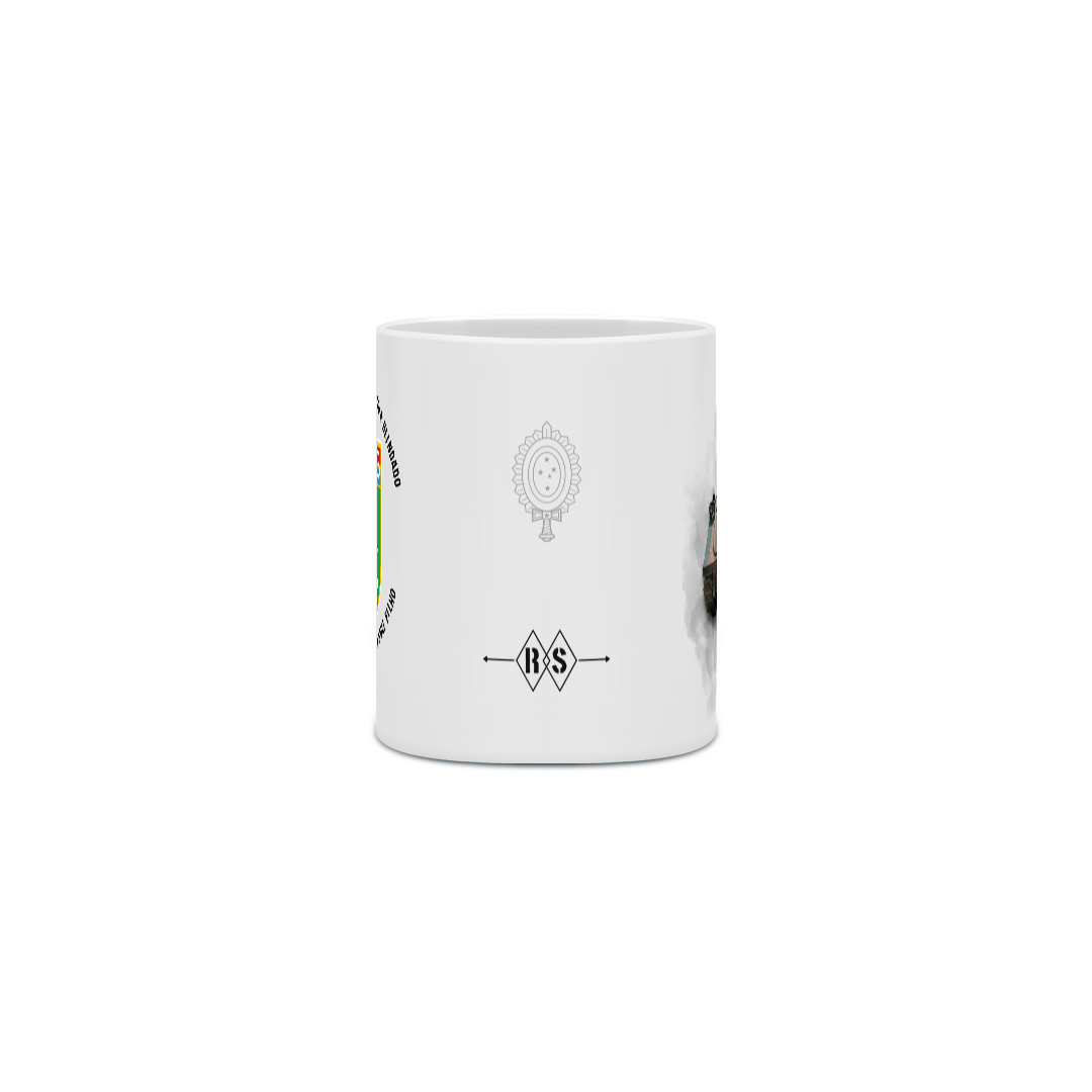 A caneca leva o brasão desta Unidade Militar histórica, que fez campanha na Itália durante a 2ª Guerra Mundial e a imagem do poderoso blindado M113BR.