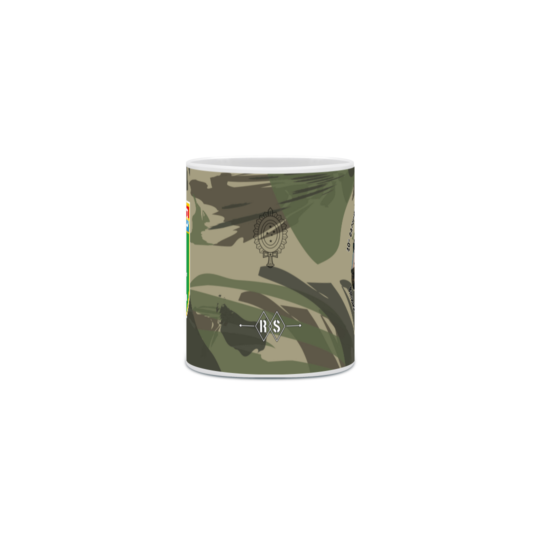 A caneca leva o brasão desta Unidade Militar histórica, que fez campanha na Itália durante a 2ª Guerra Mundial, a imagem do temível blindado M113BR, sob um fundo camuflado.