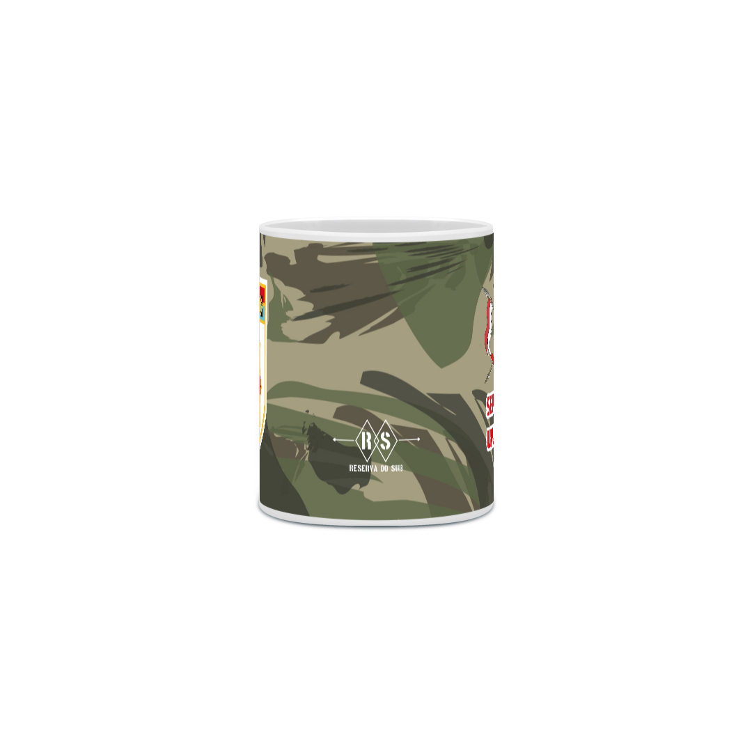 A caneca leva o brasão desta Unidade Militar histórica do Exército brasileiro e um dos lemas da Arma ligeira: "Sempre haverá uma Cavalaria".